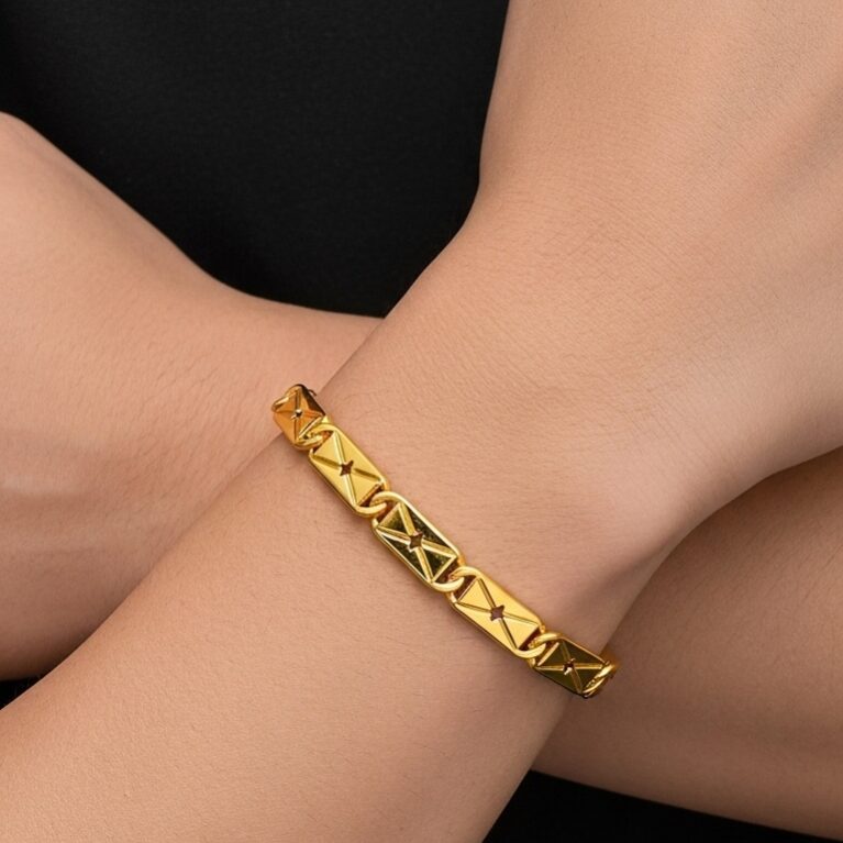 Discover the bold elegance of our Gold-Plated Biscuit Bracelet with geometric biscuit links and star-cut detailing. A 5-star rated unisex jewelry piece, perfect for everyday wear and gifting.