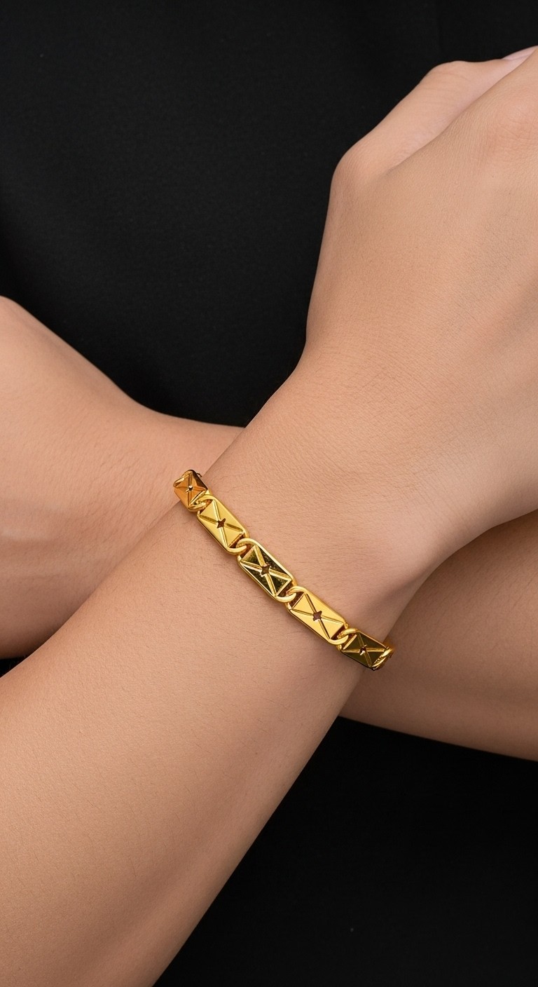 Why spend a fortune when you can have the richness of gold without the heavy price tag? This gold-plated biscuit bracelet offers the royal look of solid gold jewelry at a fraction of the cost. It is anti-tarnish, hypoallergenic, and designed to stay radiant for years, making it perfect for both daily wear and special occasions.